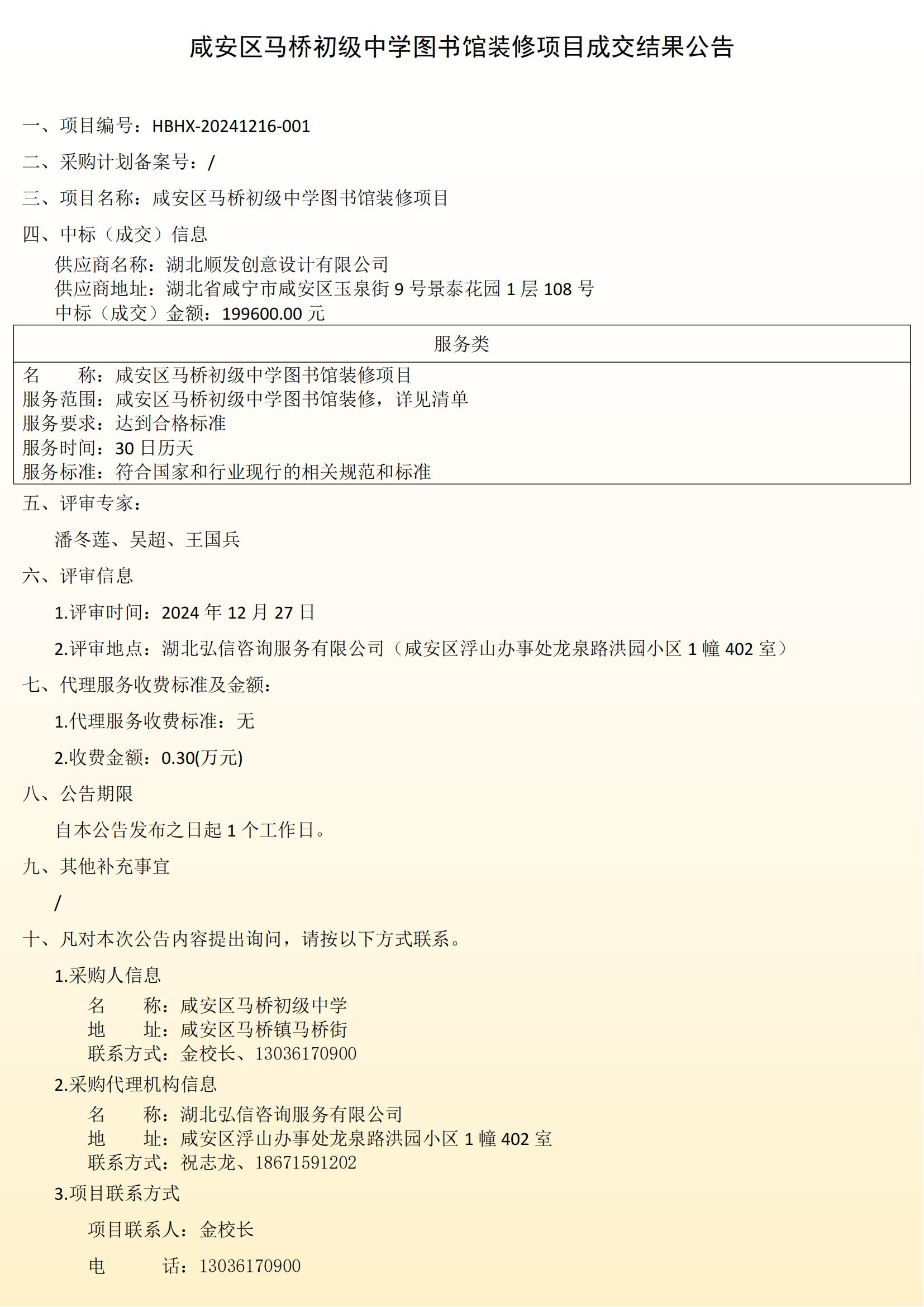 咸安区马桥初级中学图书馆装修项目成交结果公告