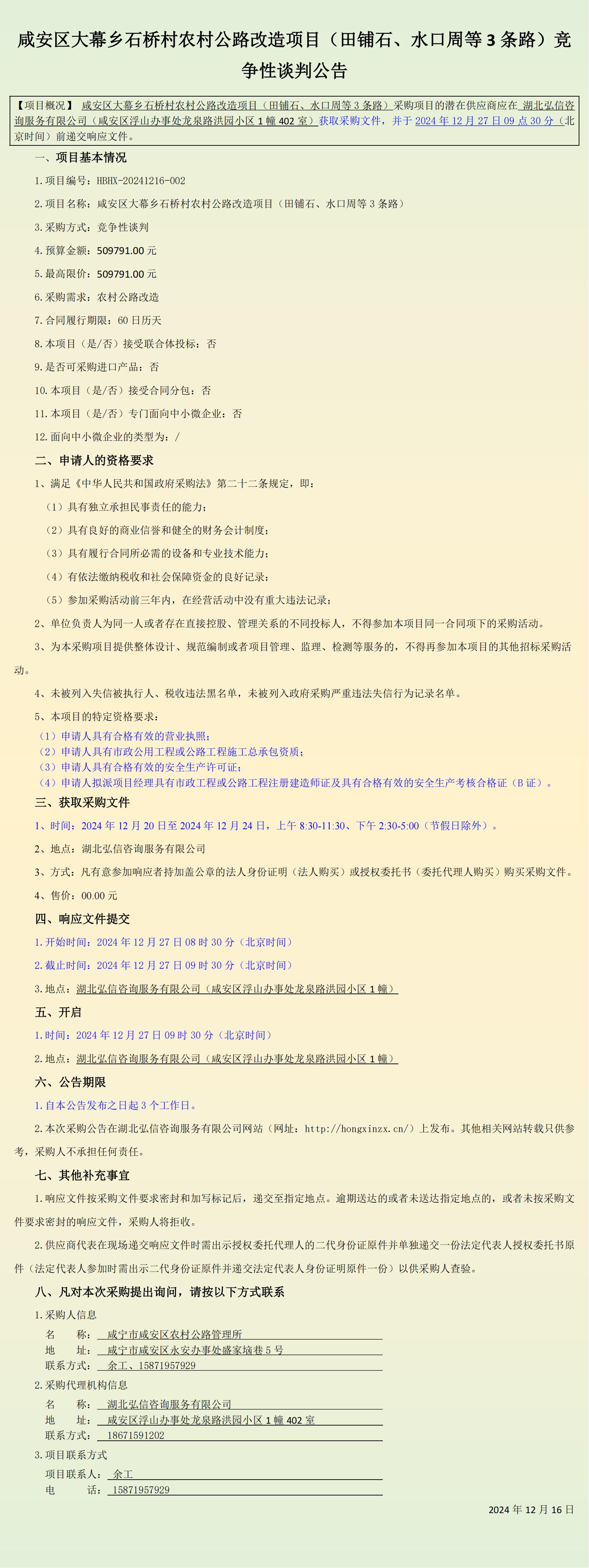 咸安区大幕乡石桥村农村公路改造项目(田铺石、水口周等3条路)竞争性谈判公告