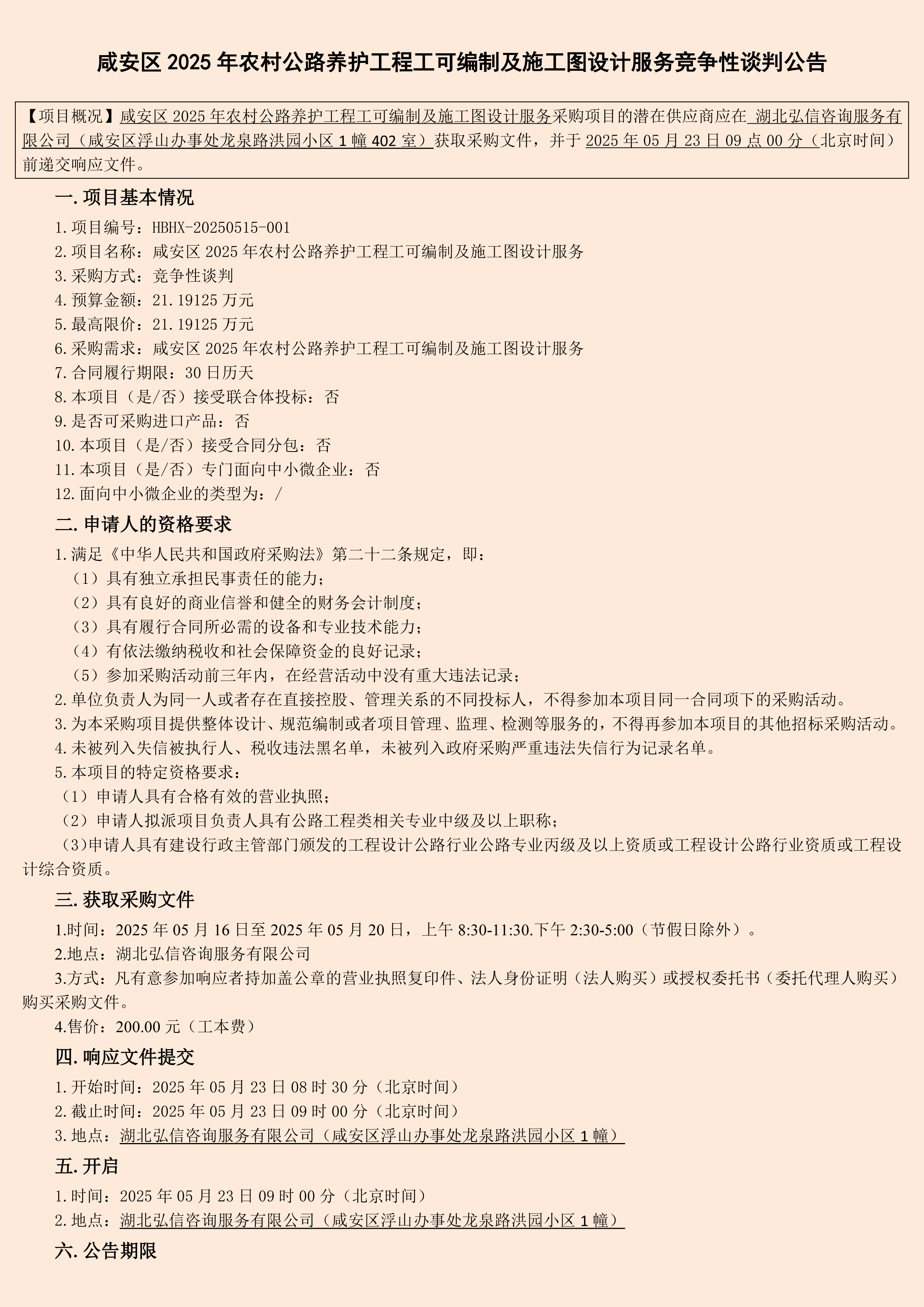 咸安区2025年农村公路养护工程工可编制及施工图设计服务竞争性谈判公告