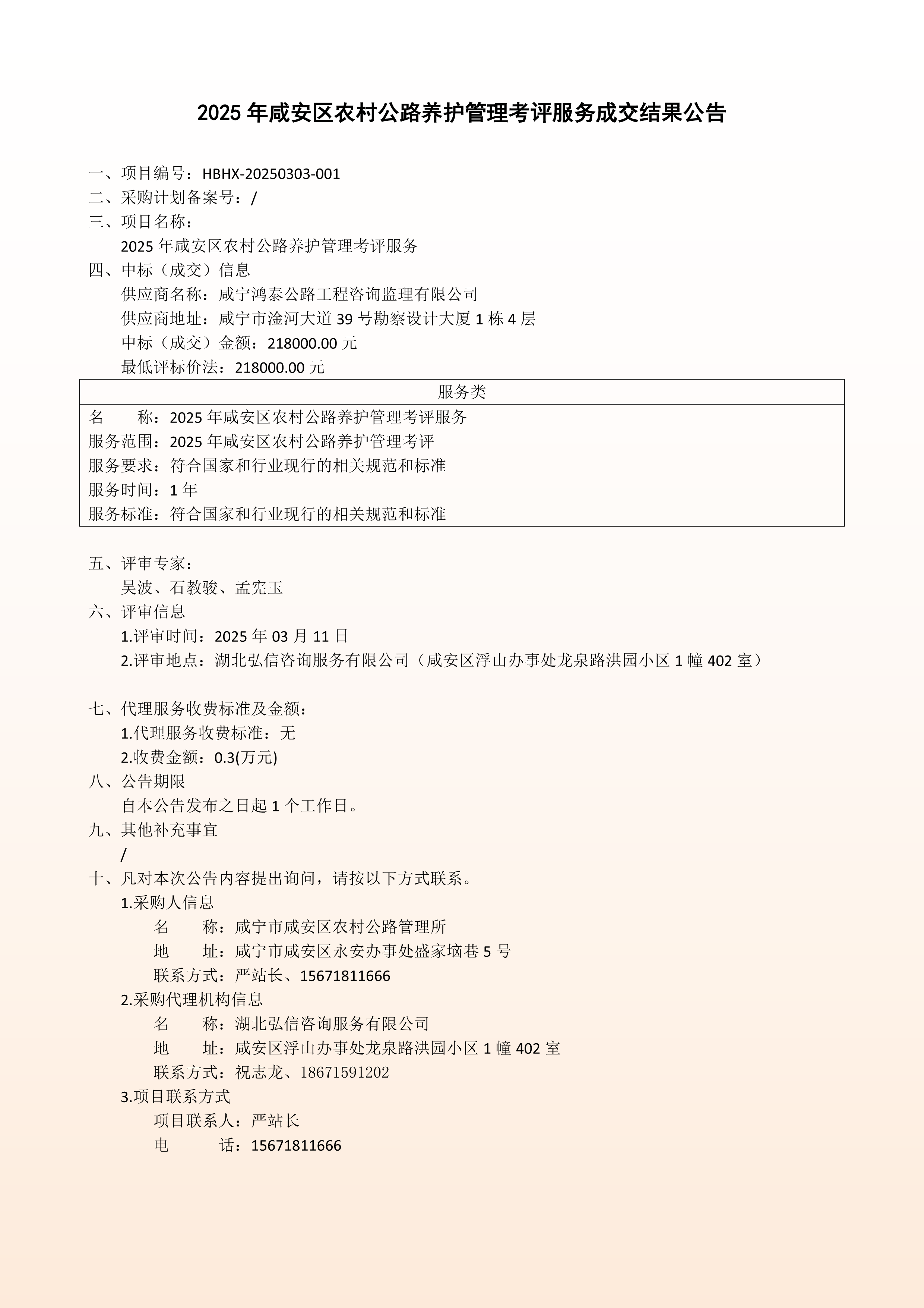 2025年咸安区农村公路养护管理考评服务成交结果公告