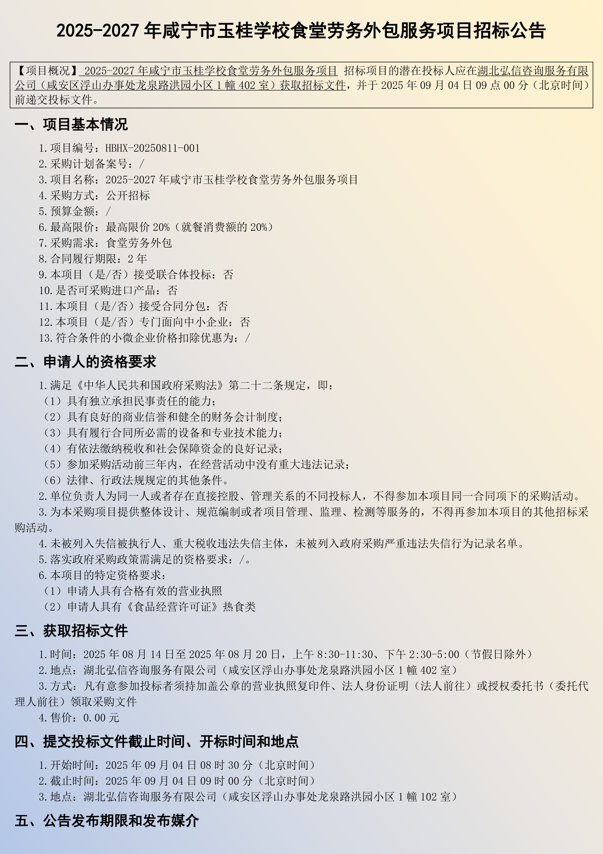 2025-2027年咸宁市玉桂学校食堂劳务外包服务项目招标公告